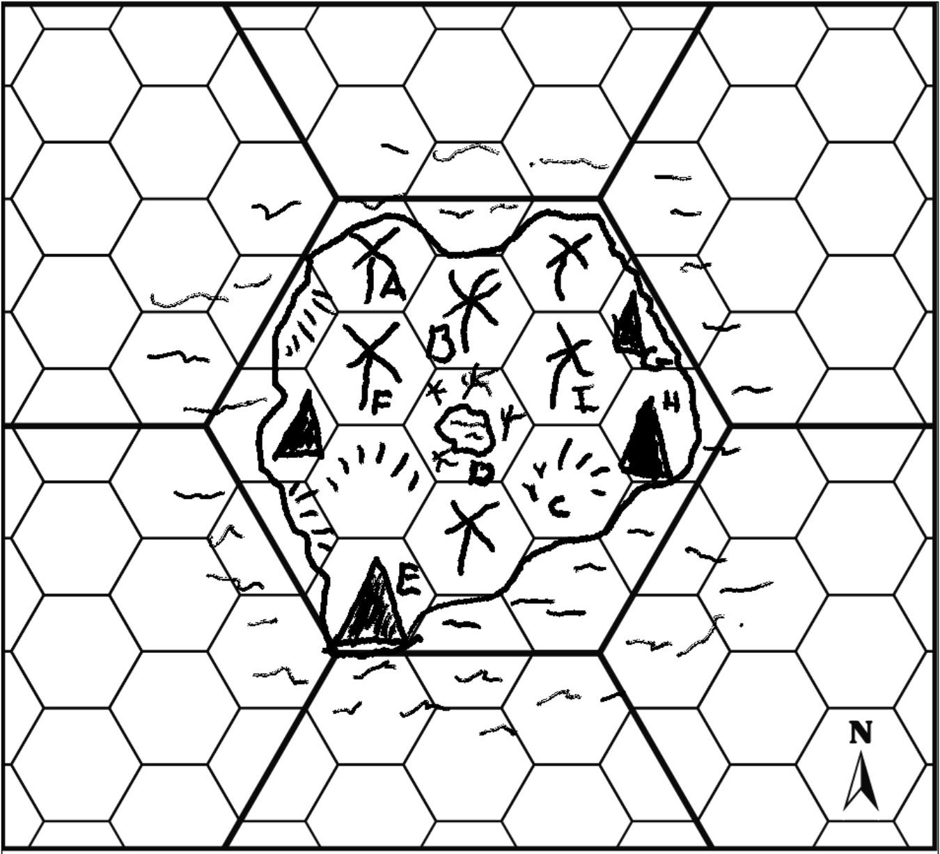 Lost Adventuring Party — this party comprises 5 adventurers: Bargo, a 6th level fighter (Lawful), Rian, an 8th level magic-user (Neutral), Brygga, a 7th level dwarf fighter (Chaotic), her brother Gorm, an 11th level dwarf fighter (Lawful), and Lyssa, a 9th level fighter and the party’s leader (Neutral). They landed here a year and a day ago, seeking treasure. Unfortunately, they met Calypso, who claimed Brennagan, the party’s thief, as her new consort. The party managed to resist Calypso’s charm song and engaged her in combat, which cost the lives of all their retainers and Brennagan. After the thief fell, the party fled from Calypso’s rage. They reached the shore only to find their boats were missing, so they’ve been stranded here ever since, hiding out in the mountains. Rian has the following spells prepared: charm person, magic missile, sleep (x2), ESP, phantasmal force, web, fireball, hold person, rope trick, polymorph other, remove curse.